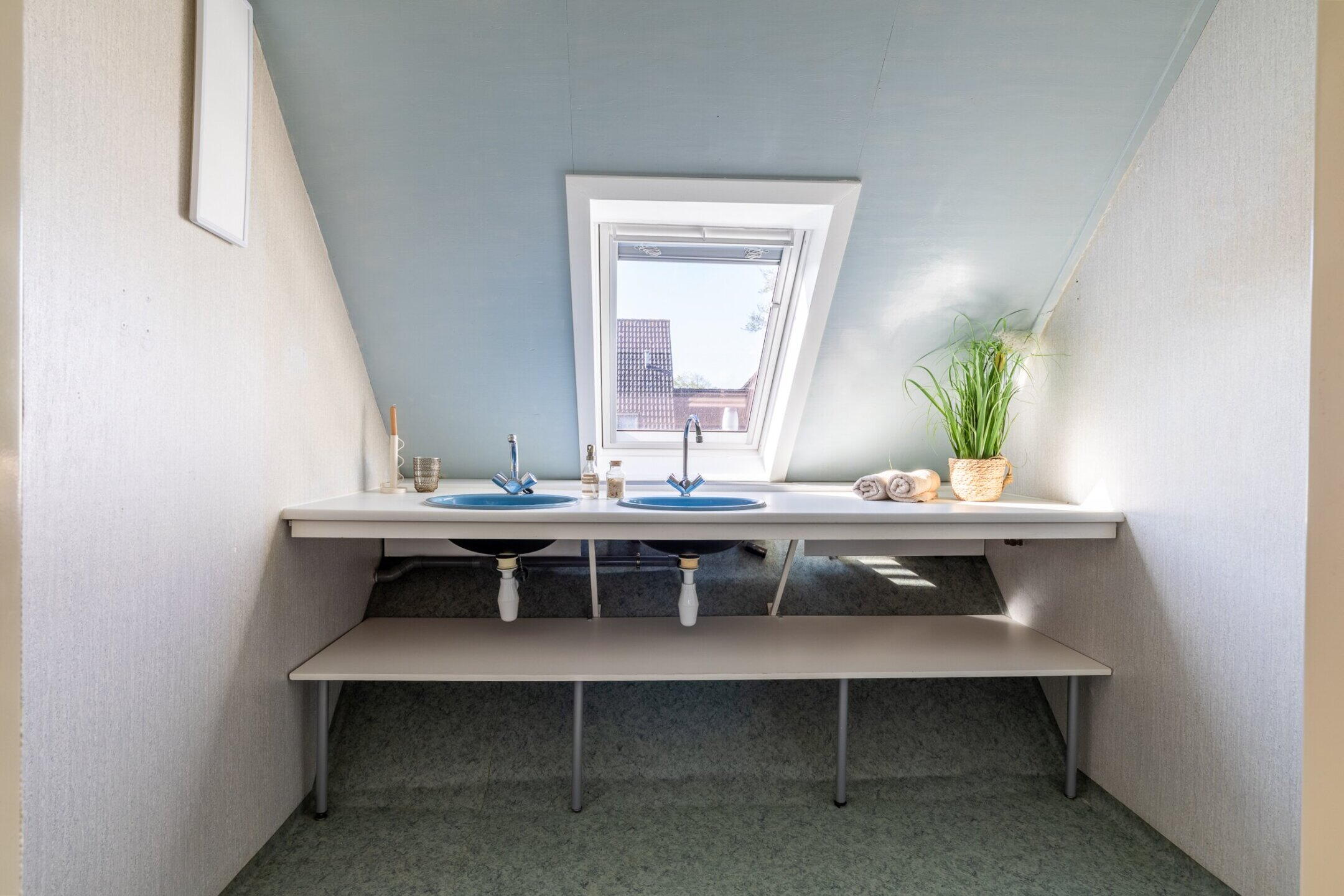 De badkamer (ca. 2.40 x 2.58/2.00m) is voorzien van een open inloopdouche, een dubbele wastafel in meubel, een dakraam en mechanische afzuiging.