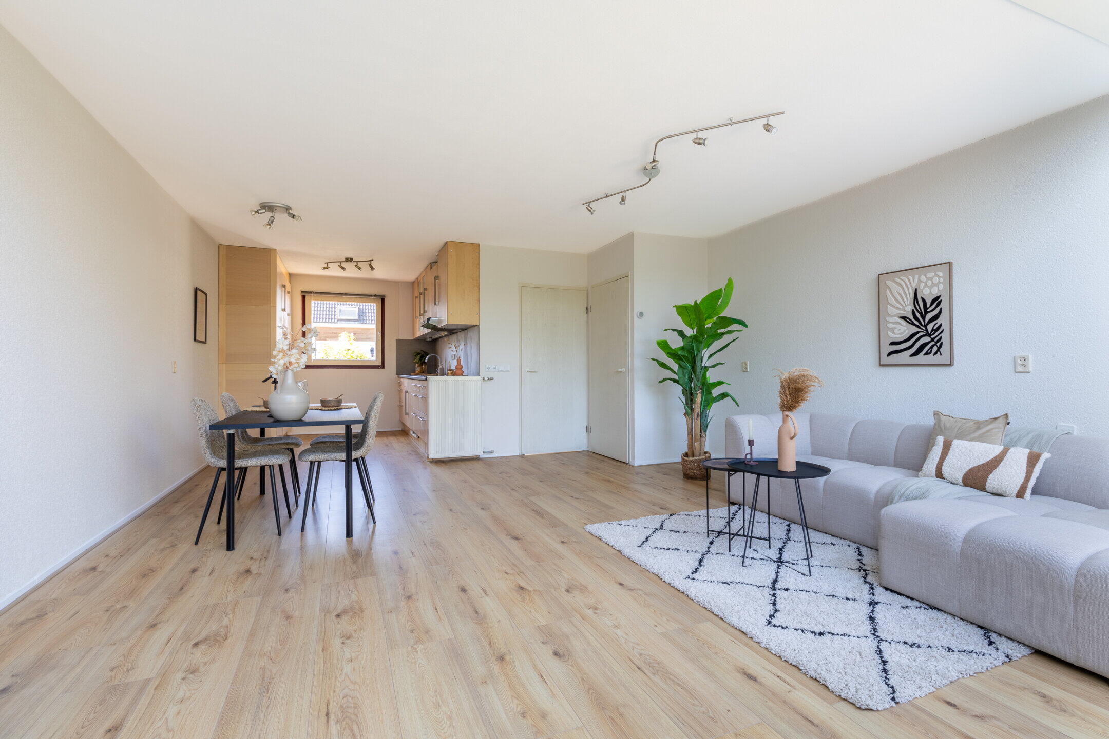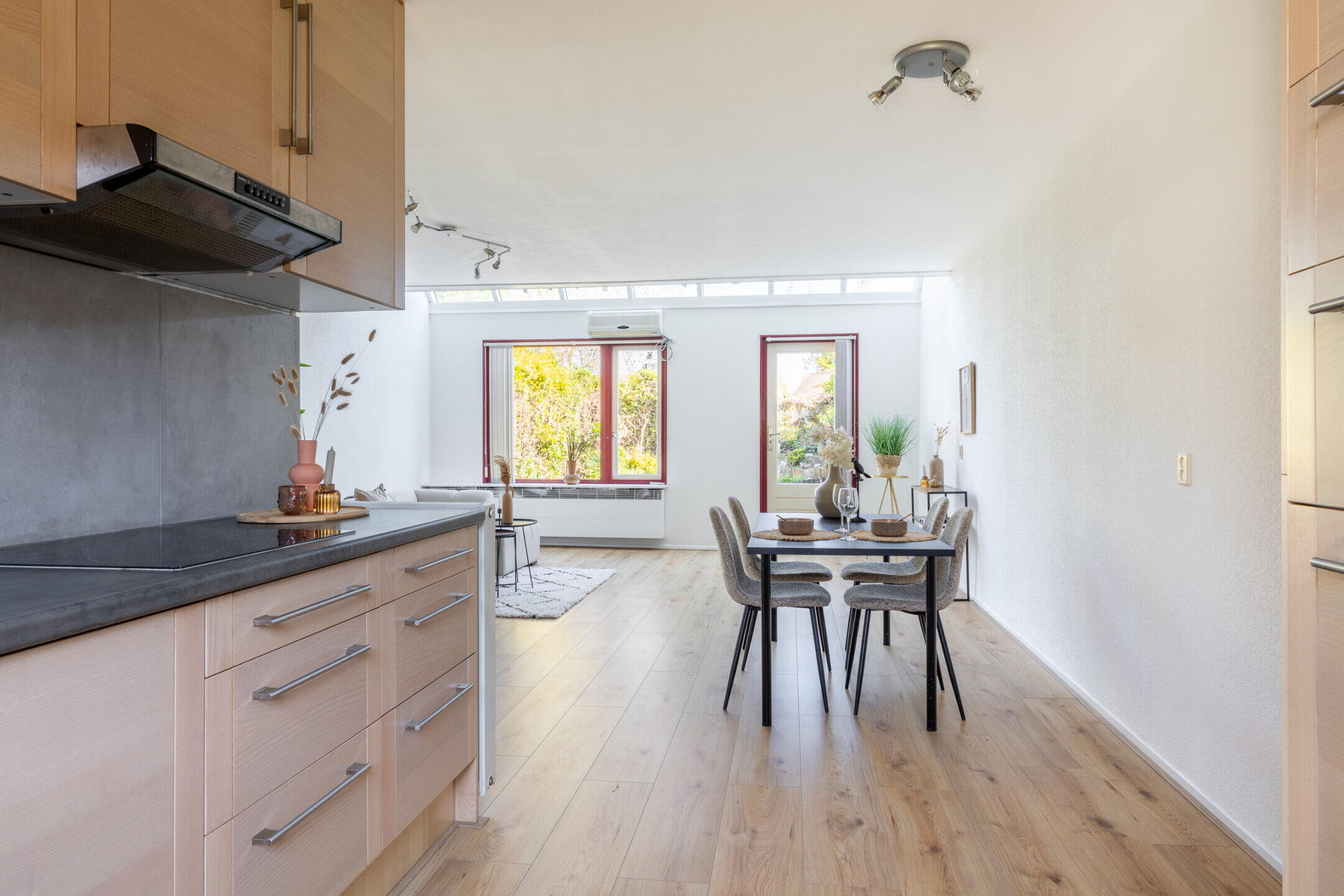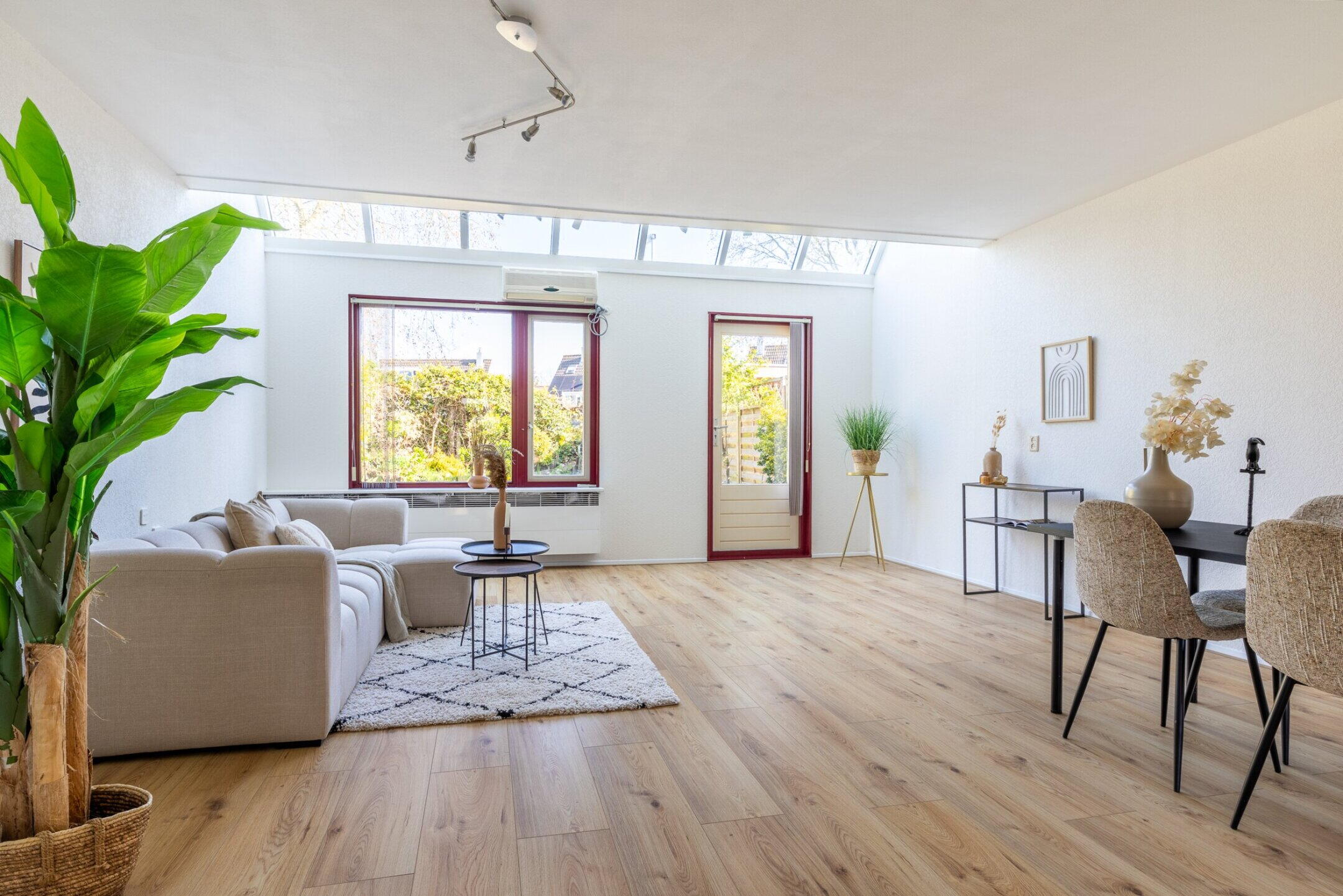 De royale woonkamer (ca. 6.38 x 5.18m) is voorzien van een nette laminaat vloerafwerking, een trapkast, een airconditioningsunit en kent een werkelijk spectaculaire lichtinval door de grote raampartijen en de unieke lichtstraat aan de achterzijde van de woning. Vanuit de woonkamer is er middels een loopdeur toegang tot de achtertuin.