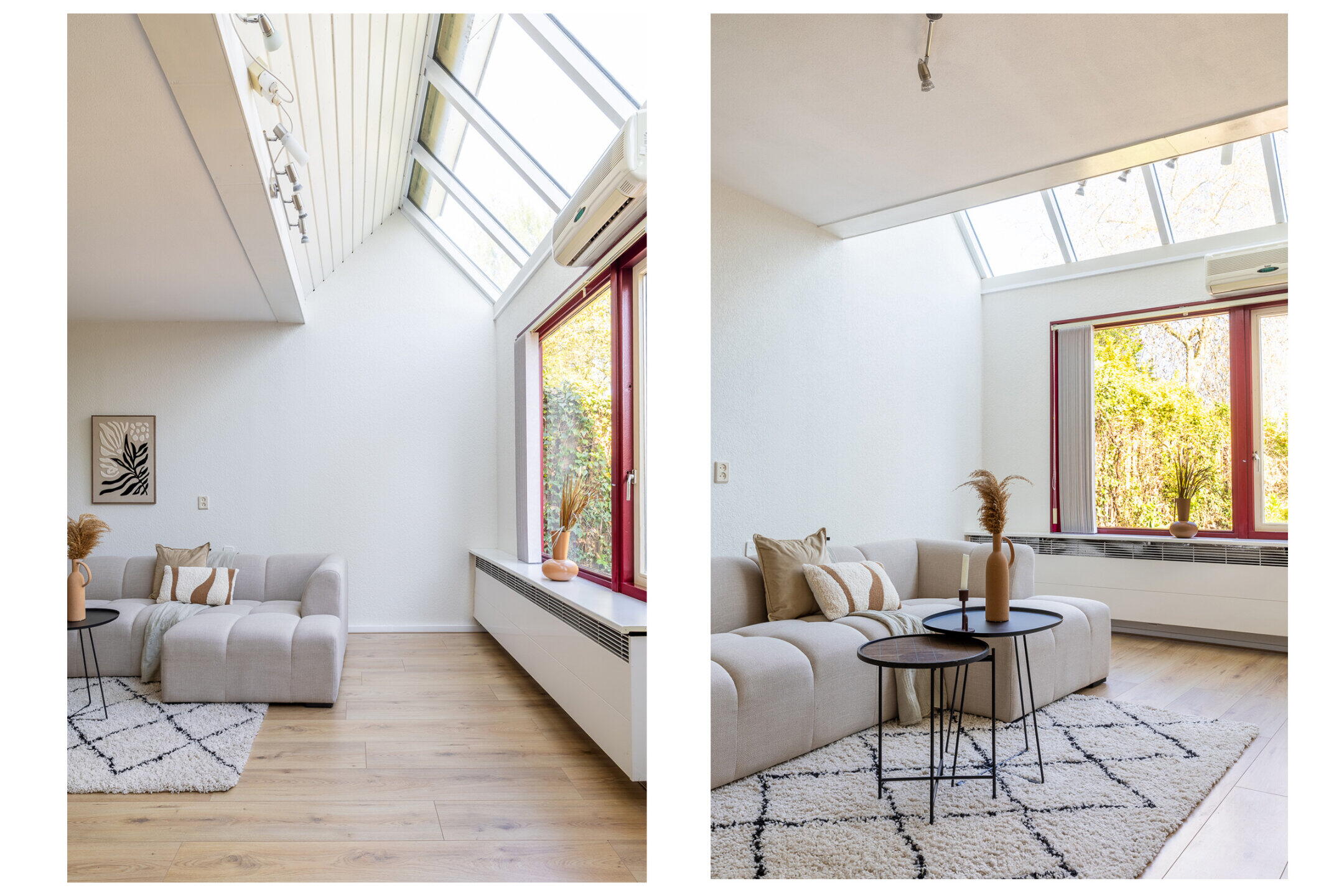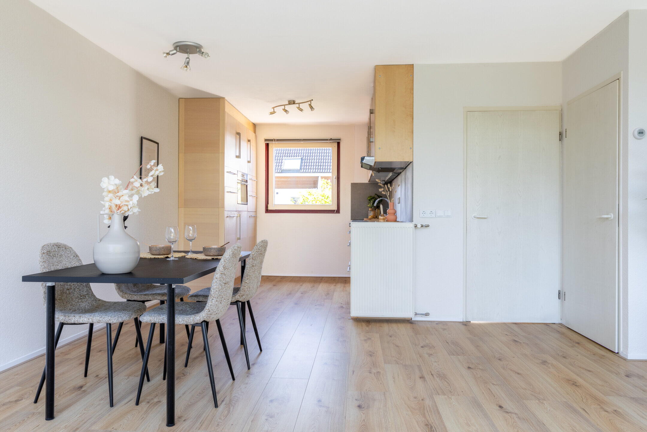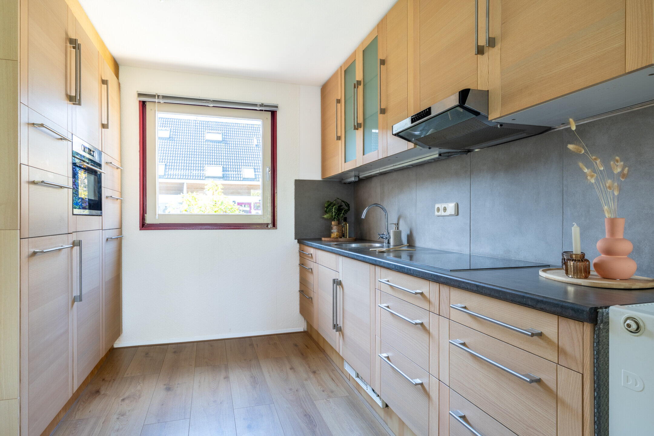 De royale woonkamer (ca. 6.38 x 5.18m) is voorzien van een nette laminaat vloerafwerking, een trapkast, een airconditioningsunit en kent een werkelijk spectaculaire lichtinval door de grote raampartijen en de unieke lichtstraat aan de achterzijde van de woning. Vanuit de woonkamer is er middels een loopdeur toegang tot de achtertuin.
