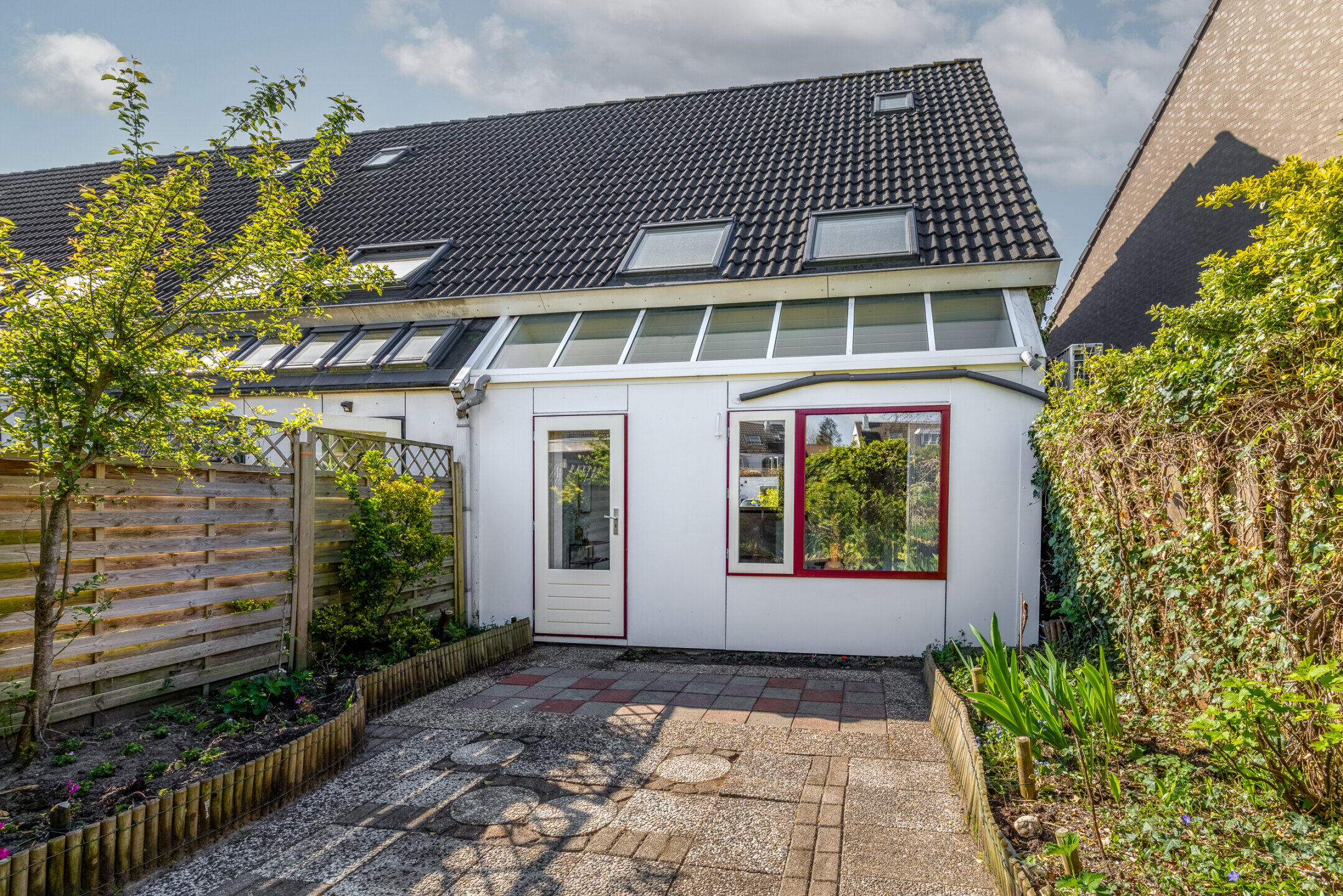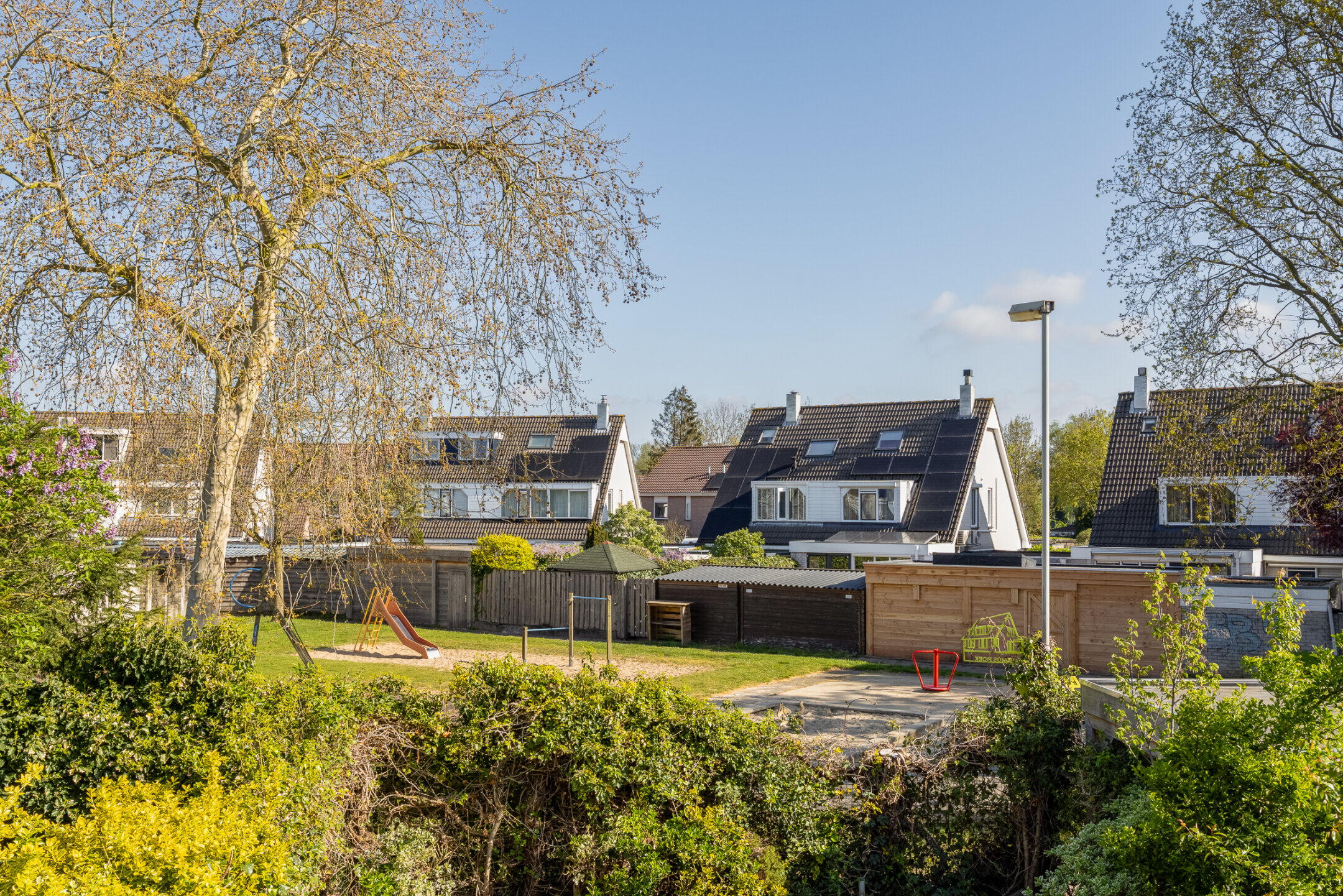 Aan de achterzijde grenst de tuin aan een groenvoorziening met diverse speeltoestellen voor kinderen.