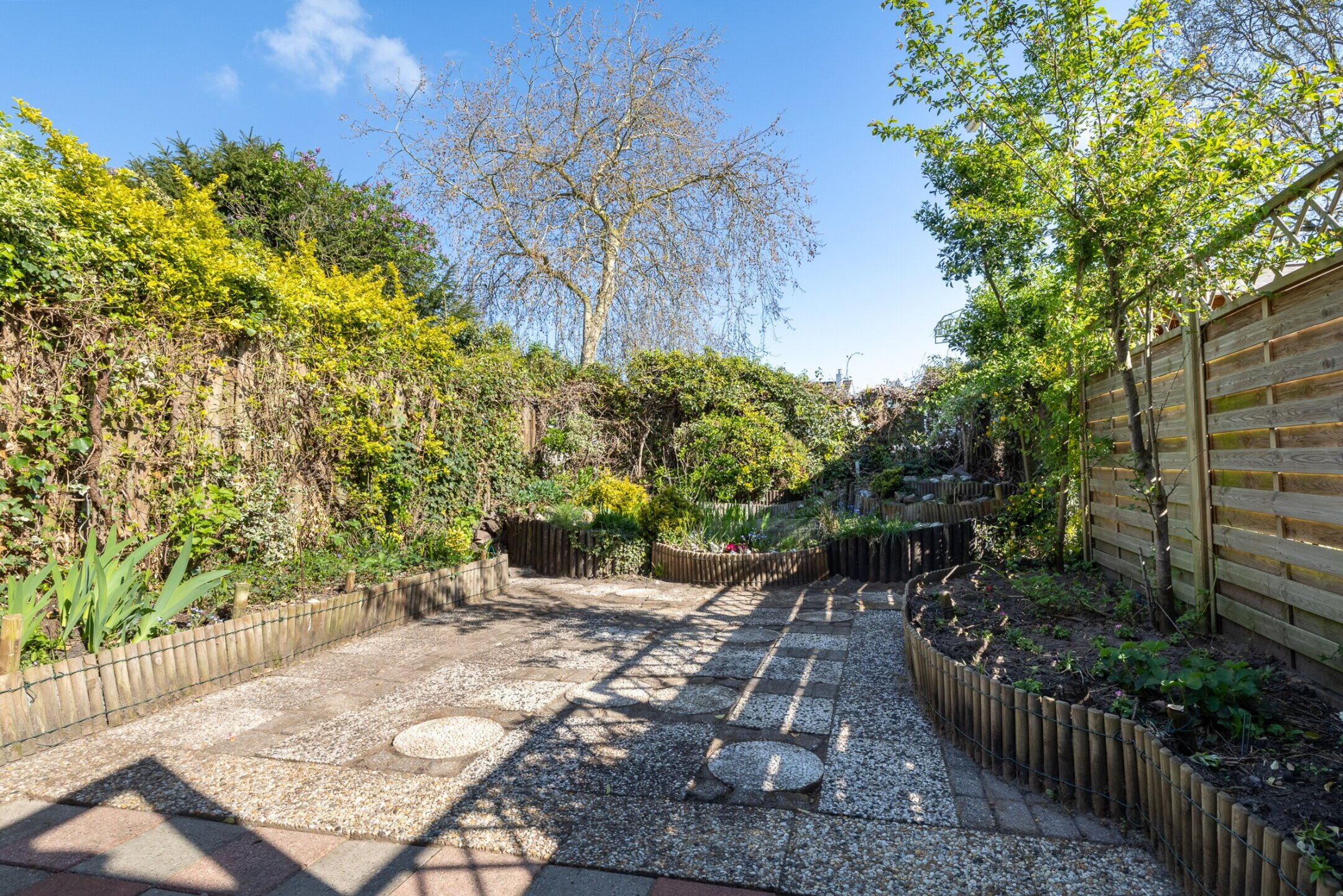 De achtertuin (ca. 9.50 x 5.80m) is fluisterstil, gelegen op het noorden en biedt volop privacy door het ontbreken van achtergelegen bebouwing. De achtertuin is voorzien van een groot terras in grindtegel, verhoogde borders met een gevarieerde beplanting, schutting en een vijverpartij.