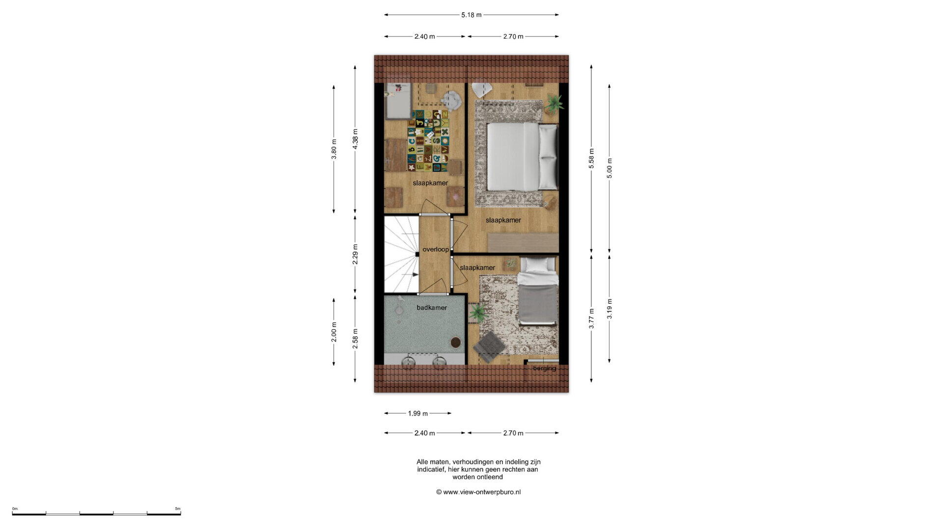 Slaapkamer 2 (ca. 5.58/5.00 x 2.70m) is gelegen aan de achterzijde van de woning.