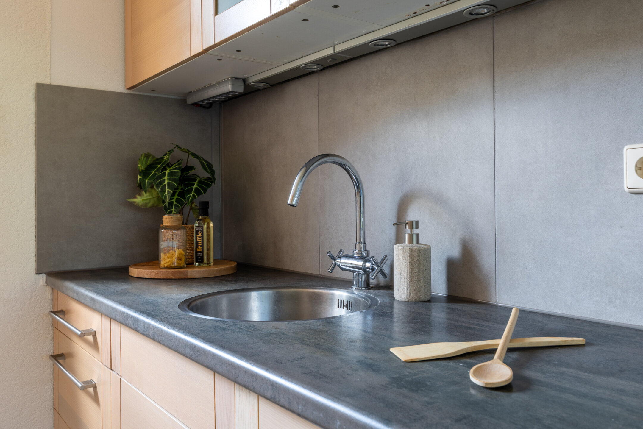 De open keuken (ca. 4.11 x 2.82m) in een dubbele wandopstelling beschikt over veel onder- en bovenkastruimte en diverse apparatuur waaronder een 4-pits inductiekookplaat, rvs afzuigkap, combi oven/magnetron, koelkast, vrieskast (4 laden), mechanische afzuiging en een ronde spoelbak.