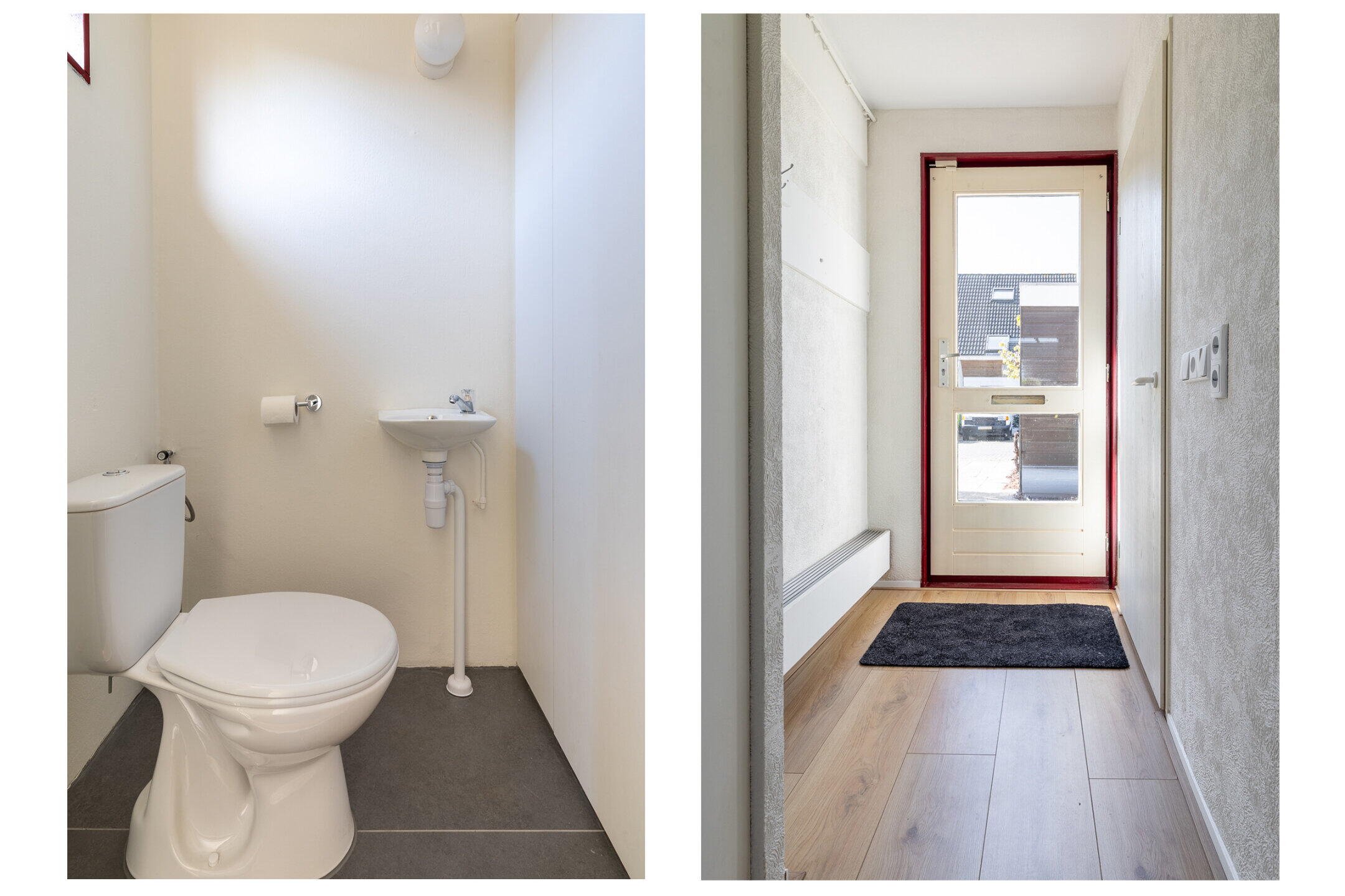 Enree/hal (ca. 4.11 x 2.28m) met de trapopgang naar de eerste verdieping, een garderobehoek, een bergkast met de meters (9 groepen en krachtstroom) en de opstelling van het doorstroomapparaat, en de toiletruimte voorzien van een closet, een fonteintje en mechanische ventilatie. Naast de toiletruimte vinden we een bergkast met de opstelling van de warmteterugwin-unit.